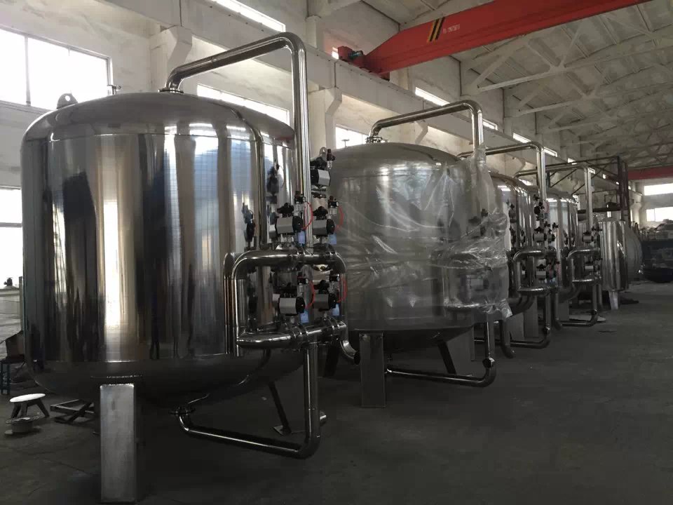 活性炭過(guò)濾器上部設(shè)有進(jìn)水裝置,下部設(shè)有排水裝置,運(yùn)行時(shí),水經(jīng)上部進(jìn)入,流經(jīng)活性炭過(guò)濾層,從底部流出。利用活性炭的表面有大量的羥基等官能團(tuán),可以對(duì)各種性質(zhì)的物質(zhì)進(jìn)行化學(xué)吸附,除去水體中異味、有機(jī)物、膠體、鐵及余氯等,同時(shí)降低水體的濁度、色度,使水質(zhì)清澈透明,減少對(duì)后續(xù)系統(tǒng)(反滲透、超濾、離子交換器)的污染。